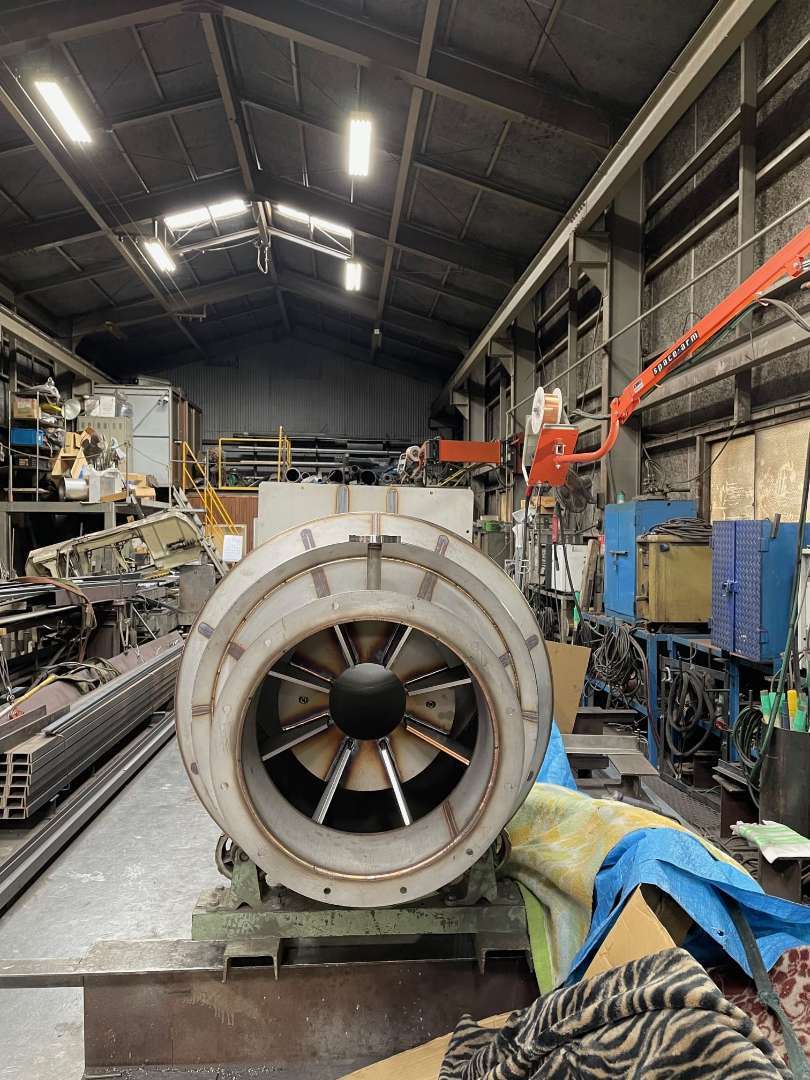 製作にあたっては、筒状部材の精密曲げ加工から羽根構造の内部取り付け、各接合部の全周TIG溶接までを一貫して自社工場にて実施。構造の複雑さに加えて長さ方向の通直性や端面の垂直精度にも注意を払い、後工程との整合性を見据えた高精度な仕上がりを実現しました。
